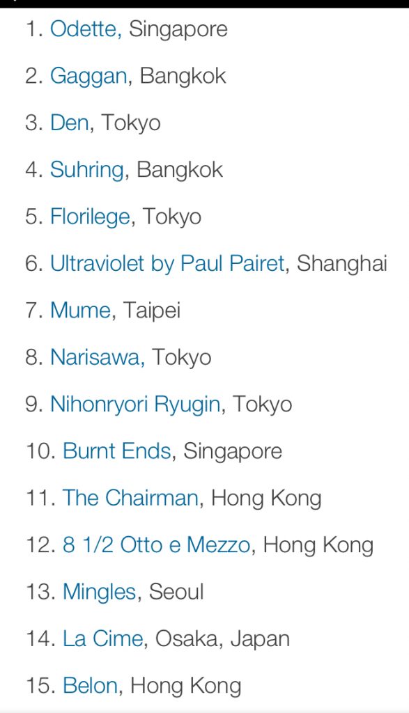 यसपालि पहिलो स्थान भने सिंगापुरको ओडेट रेष्टुरेन्टले हात पार्यो। यस रेष्टुरेन्टका सेफ जुलियन रोयर हुन् र यो रेष्टुरेन्टको विशेषता भनेको यहॉ एसियन स्वादमा फ्रेन्च परिकार पाइन्छ। दोस्रो स्थान भने बैंककमा रहेको ४ पटकको पूर्व विजेता इन्ड्यन रेष्टुरेन्ट गगनले हात पार्यो।