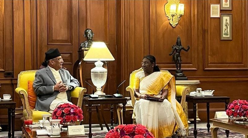 काठमाडौं । भारतको औपचारिक भ्रमणमा रहनुभएका प्रधानमन्त्री पुष्पकमल दाहाल ‘प्रचण्ड’ले राष्ट्रपति द्रौपदी मुर्मुसँग शिष्टाचार भेट गर्नुभएको छ । नयाँ दिल्लीस्थित राष्ट्रपति भवनमा प्रधानमन्त्री दाहालले राष्ट्रपति मुर्मुसँग आज भेट गर्नुभएको हो ।