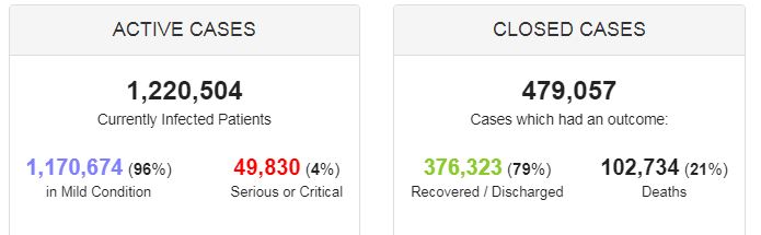 त्यस्तै ३ लाख ७६ हजार ३ सय २३ जना निको भएका छन् भने १ लाख २ हजार ७ सय ३४ जनाकाे मृत्यु भएकाे छ । यस हिसावले ७९ प्रतिशत बिरामी निकाे भएर घर फर्किएका छन भने २१ प्रतिशतले मृत्युवरण गरेकाछन ।
