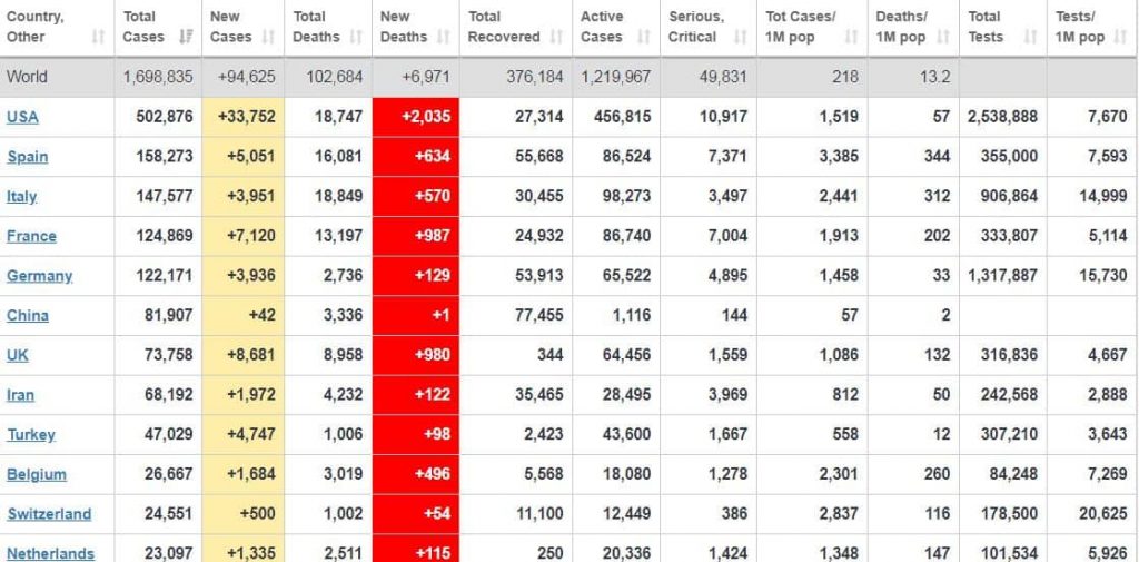 विश्वभर १७ लाखमा संक्रमण, अमेरिकामा मात्रै ५ लाख : दैनिक करीब १ लाख थपिदै