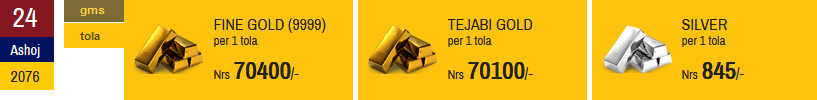 यसैगरी, चाँदीकाे मूल्य दशै अघि उच्च बृद्धी भएकाेमा आज केही ह्रास आएकाे छ । दशैअघि चाँदीको मूल्य प्रतितोला ८ सय ५० रूपैयाँ थियाे भने आज प्रति ताेला ५ रूपैयाँले घटेर ८ सय ४५ रूपैयाँमा खरिदबिक्री भएको नेपाल सुन चाँदी व्यवसायी महासंघले जनाएकाे छ ।