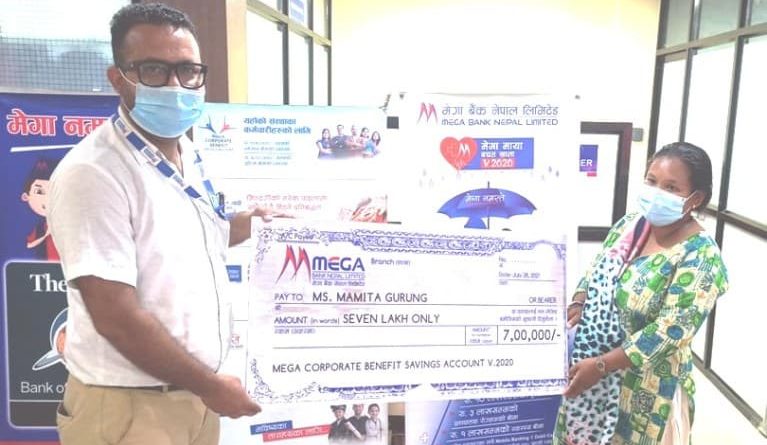 मेगा बैंकमा ‘मेगा कर्पोरेट बेनीफिट सेभिङ अकाउन्ट’ खोलेका हिमालय गुरुङका परिवारलाई मेगा बैंकले सोही खातामा भएको योजना बमोजिम बिमा बापत सात लाख रुपैँया हस्तारन्तरण गरेको हो ।